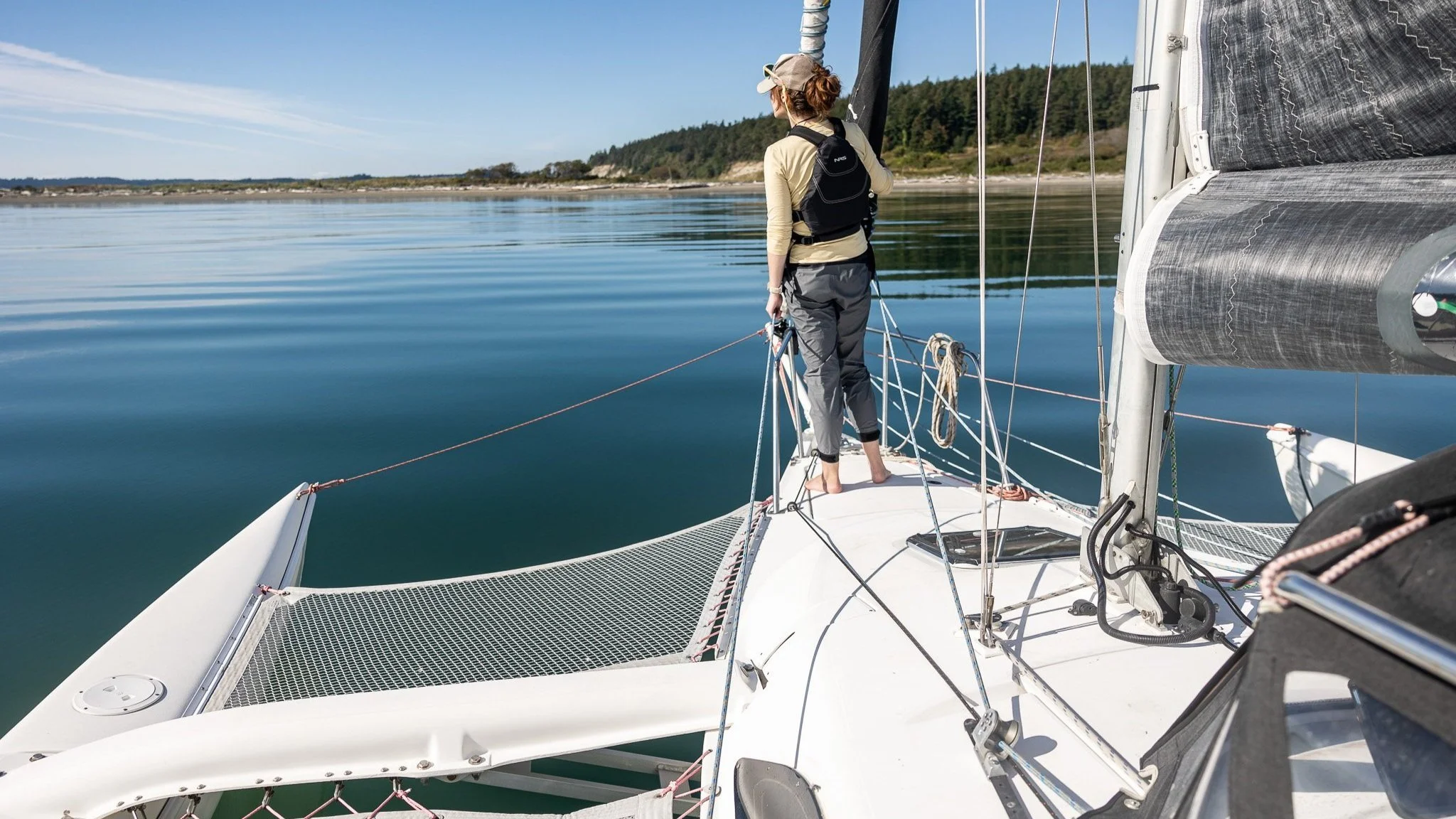 Sail plan – Mainsail, Jib, Screecher, and asymmetrical Spinnaker Windy offers a comfortable and unique day-sailing experience. With her midship and forward lounging nets and a beam of 18 feet, she has a surprising amount of enjoyable space. Windy combines lightweight performance and comfortability, making her ideal for afternoon sailing in the protected waters of Penn Cove and the San Juans. Windy has a cozy cabin heater, deck blankets, and automatic life jackets for all guests.